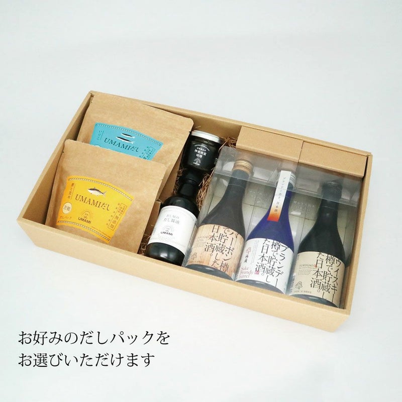 だしパック2袋と神楽南蛮味噌、だし醤油、洋酒樽で貯蔵した日本酒セットが入った詰合せギフトです。 UMAMIだしシリーズと悟りだしシリーズから、お好きなだしパックを2袋をお選びいただけます。 包装済みでお届けいたします。のし紙、手提げ袋のご要望がありましたら、ご用命ください。