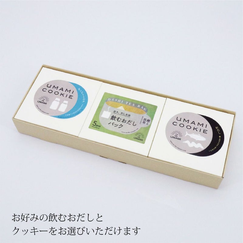UMAMI Cookie 2箱と日々、だし生活 飲むおだしパック1箱の詰合せギフトです。