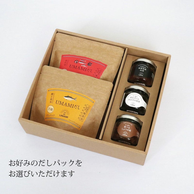 だしパック2袋とご飯のお供がセットになった詰合せギフトです。 だしパックはUMAMIだしシリーズと悟りだしシリーズから、お好きなだしパックを2袋、お選びいただけます。 包装済みでお届けいたします。のし紙、手提げ袋のご要望がありましたら、ご用命ください。