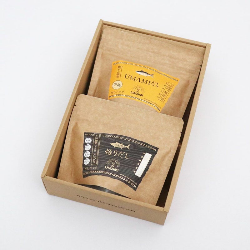 鰹と昆布の合わせだしパック「UMAMIだし鰹と昆布」と、原料仕入れからこだわっただしパック「悟りだし」の詰合せです。鰹と昆布のうまみが効いたダシと最高級の本枯鰹節ダシをお楽しみください。 包装済みです。のし紙も無料でお付けいたします。