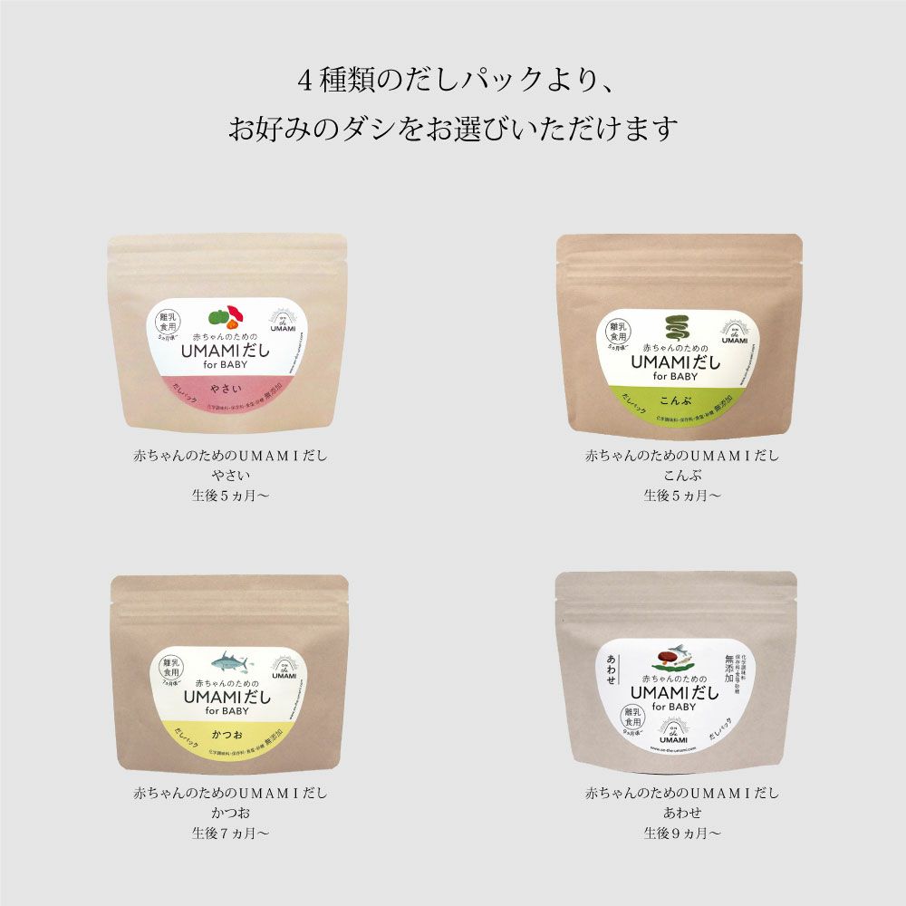 UMAMI FOR BABYシリーズは心の奥深くに根付き、 生涯にわたる味覚を支える「おいしい記憶」づくりを行うママ、 パパが安心して使用できる素材100%の無添加シリーズです。