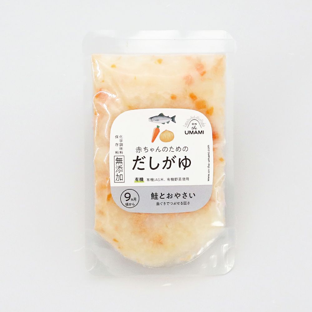 国産銀鮭、国産有機野菜を使用しただしがゆです。鮭はやわらかくて加熱しても固くなりにくい銀鮭を使用、野菜は国産の有機にんじんと有機たまねぎを使用しています。