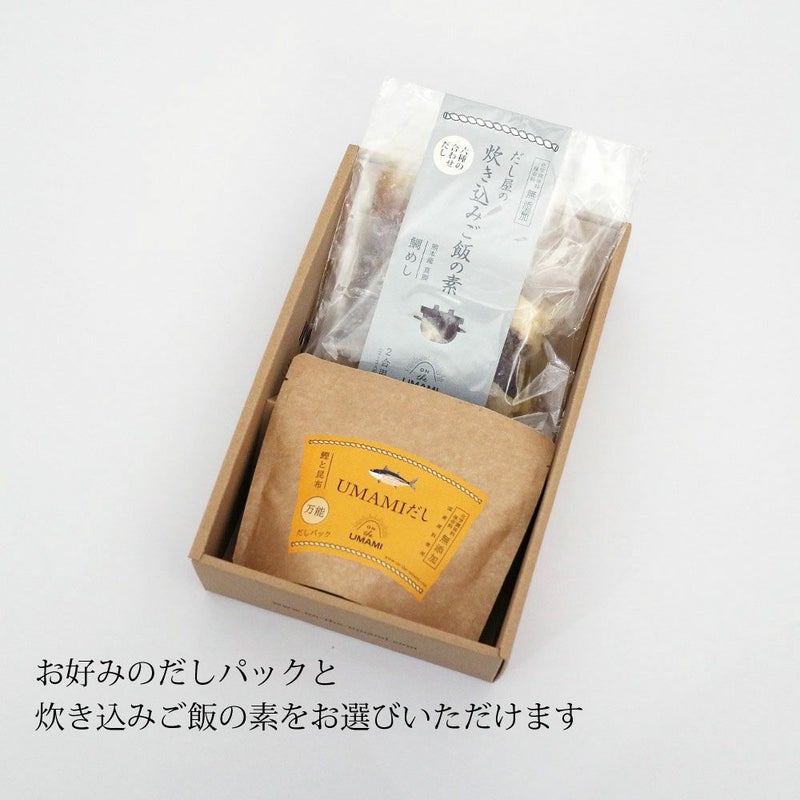 だしパック1袋と炊き込みご飯の素 1袋の詰合せギフトです。 UMAMIだしシリーズと悟りだしシリーズから、お好きなだしパックを1袋、炊き込みご飯の素1袋をお選びいただけます。 包装済みでお届けいたします。のし紙、手提げ袋のご要望がありましたら、ご用命ください。