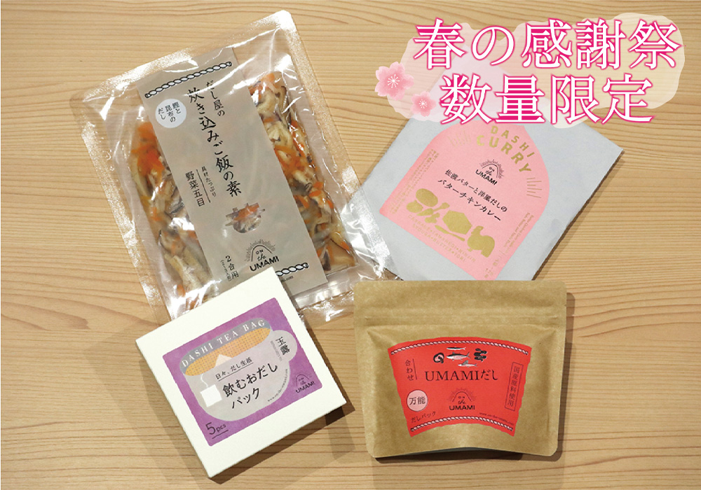 ON THE UMAMIがお届けする、イベント限定お楽しみ袋。 人気のだしパックや炊き込みご飯の素などを詰め合わせた、UMAMIがぎゅっと詰まった祝袋です。