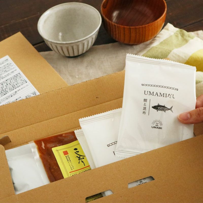 UMAMIだし 鰹と昆布、合わせ、いりこ、あご、野菜、悟りだし本枯鰹節、悟りだし鰹と昆布の7種類のおだしで様々な味噌汁が味わえるみそ玉キット。